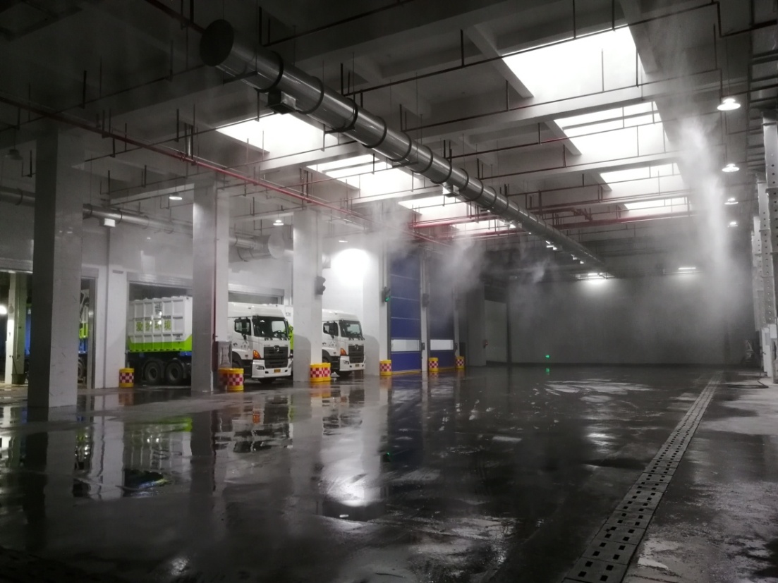 除裝備本身密封性強(qiáng)之外,整個轉(zhuǎn)運(yùn)站卸料大廳、卸料口及轉(zhuǎn)運(yùn)大廳,引入了負(fù)壓抽風(fēng)除塵除臭系統(tǒng)和空間噴淋除臭系統(tǒng),全方位除塵除臭。